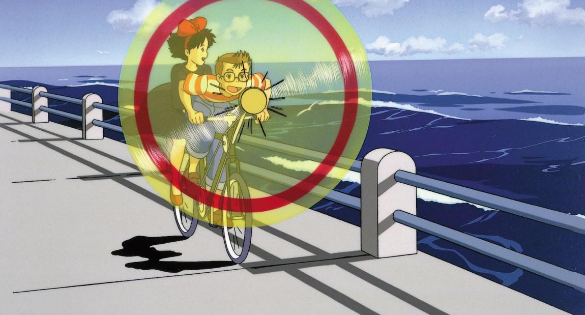 Tombo taking Kiki for a ride on his man-powered aircraft engine in Kiki’s Delivery Service, 1989