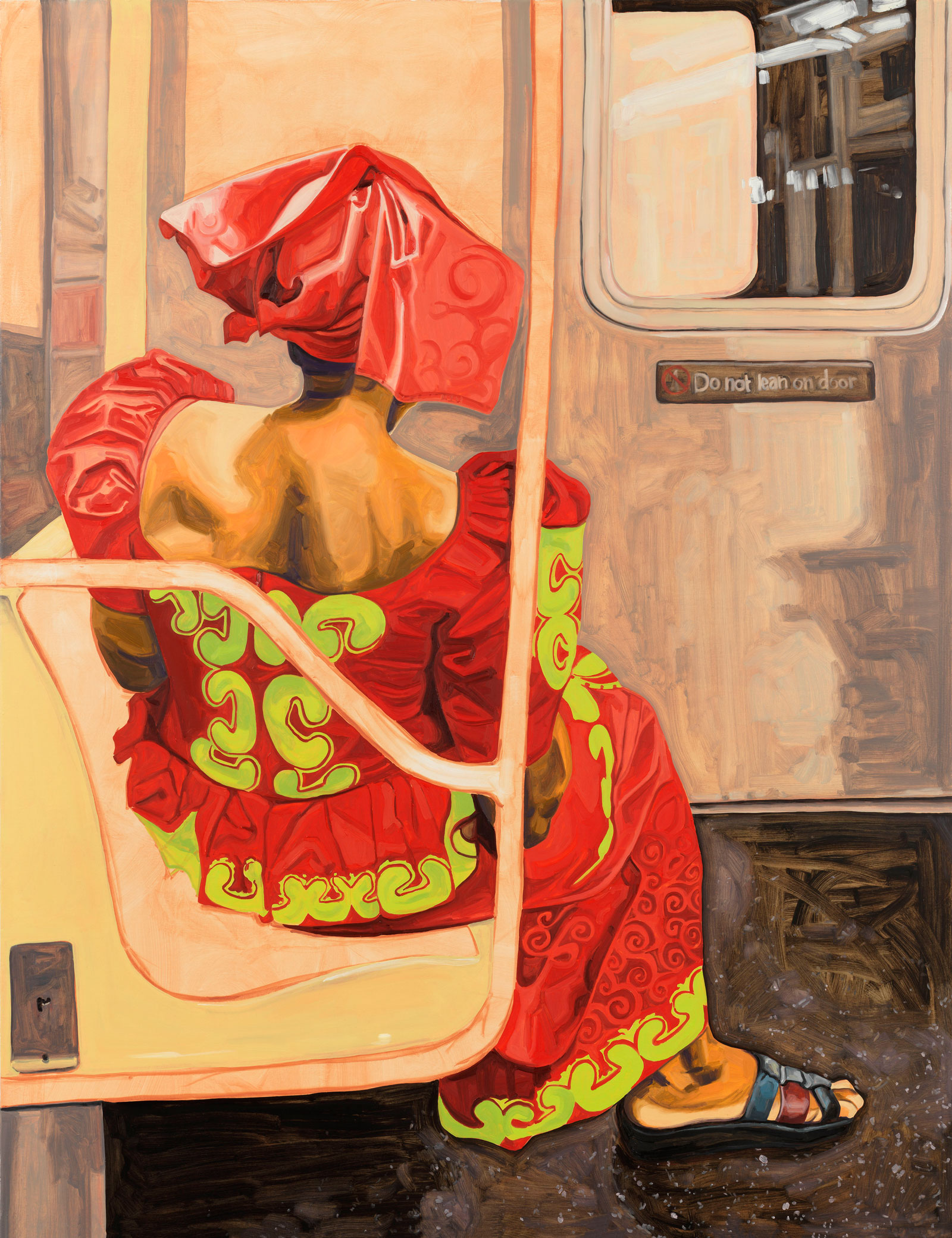 “Within Reach” is Casteel’s first solo museum show in New York City. It opened in February, just before the pandemic closures and soon after her 1,400-square-foot mural The Baayfalls—based on a painting she made in 2017 of the Senegalese-born fashion designer and Harlem street vendor Fallou Wadje and her brother, Baaye Demba Sow—went on display at the High Line. While the museum was closed, Casteel’s exhibition was available only virtually, an experience that offered viewers a rare opportunity to hear a description of her paintings in her own words. With James (2015), she says, she instantly recognized the potential for a portrait as she passed James selling CDs outside Sylvia’s Restaurant, while she was an artist in residence at the Studio Museum in Harlem in 2105–2016. “There was a light that shone on him that I’ve never seen a light shine on anyone in my life,” she recalled. But she almost missed the moment. “I was too much an introvert and too terrified to approach him,” she said. “But I realized that I made a grave mistake, that the world had literally handed me a painting on a stick.” So Jordan went back and photographed him, an exchange that “changed everything” for her.