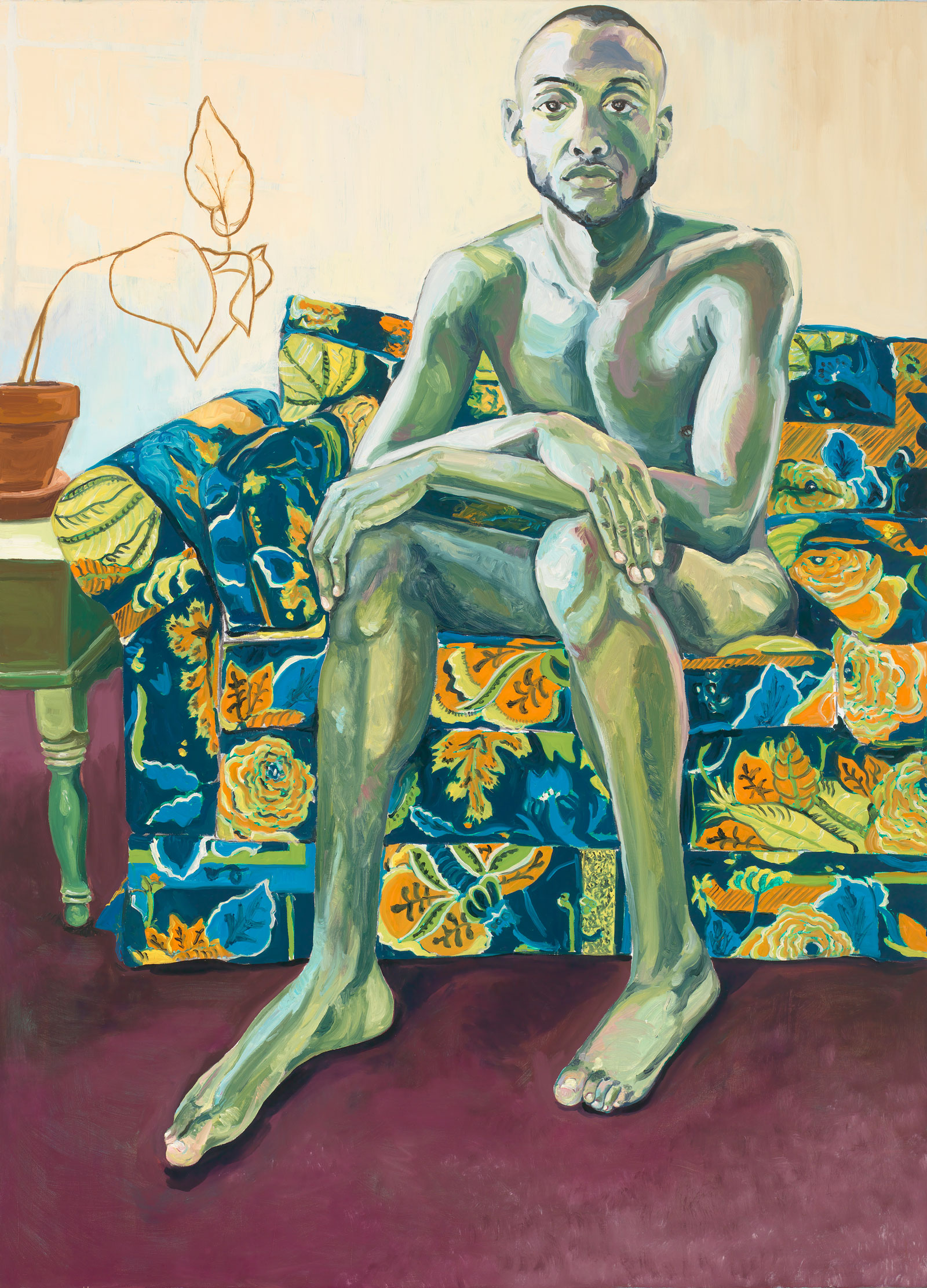 I actually forgot about that until right now. I think that’s the kind of subconscious decision-making that was occurring for me. While I was in graduate school, I would just paint my friends. But with the nudes in “Visible Man” in particular, the scale became really important because I was thinking about the way that Black male bodies have existed in the visual and historical realms in the Americas, and how they’ve been villainized, made to feel small, disrespected. I just wanted to give them as much room as possible, and for them to be unapologetically present and wholly themselves in their humanity, regardless of their location. I also love the idea that they could feel like they’re stepping out of the canvas, and that collectors would have to make room for these people. In some cases, their feet literally press up against the frame—that of the canvas, but also it’s the frame of what they’ve been told is permissible for their existence that they’re pushing up against.