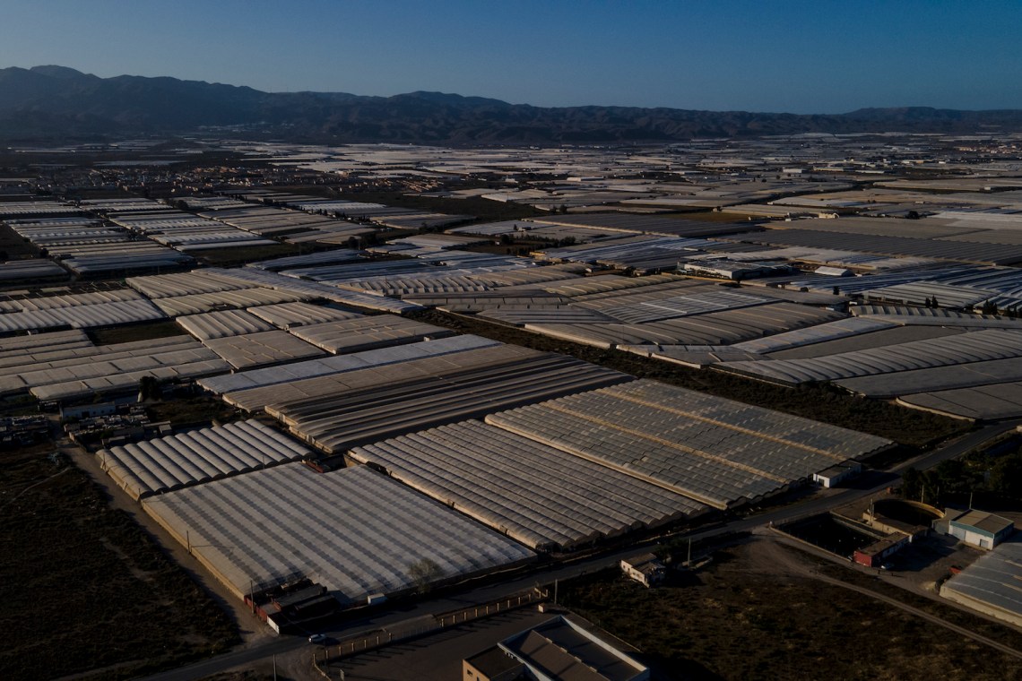 As you get closer to Almería, you leave behind the olive and almond trees and enter an expanse of plastic greenhouses. According to governmental data, Almería yields about 54 percent of Andalusia’s fruit and vegetable exports—chiefly tomatoes, cucumbers, and peppers—amounting to €3.7 billion in sales last year. They boost the country’s economy and allow Europeans to eat fresh salads year-round. Satellite images show a sea of plastic that extends from the foot of the mountains to the shores of the sea.