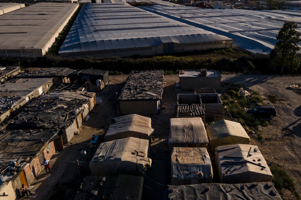 A camp inhabited by migrant laborers next to the greenhouses where they produce fruits and vegetables for export, Níjar, Almería, Spain, April 2023
