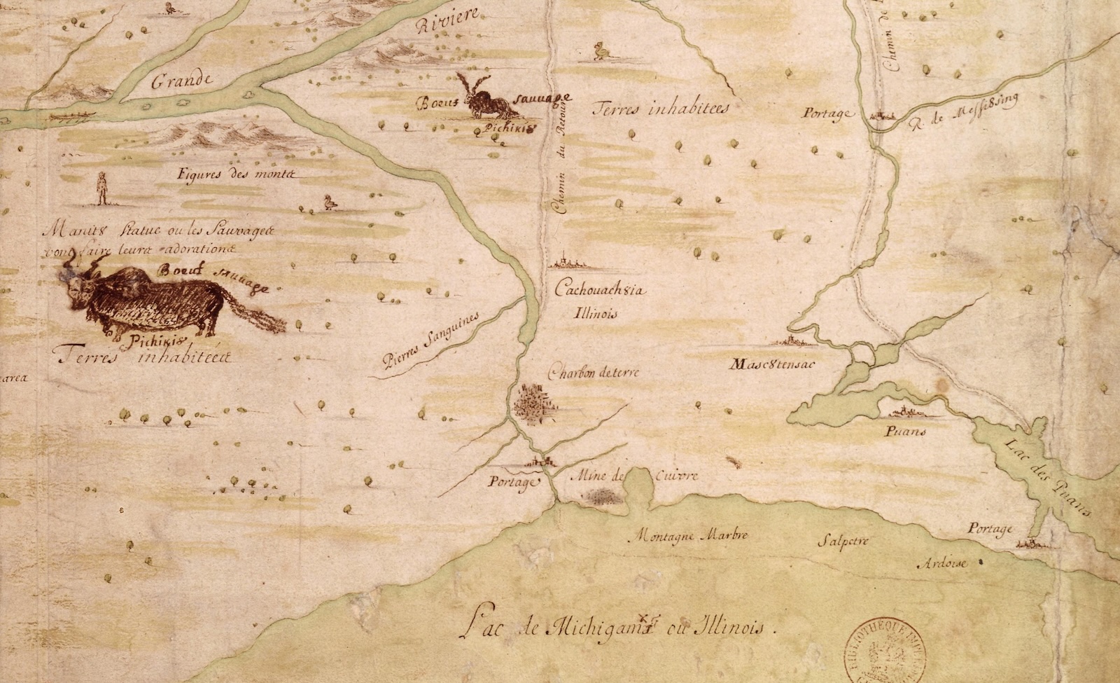 In his journals Marquette wrote that the first people they met on the river called themselves the Illinois, a name later mapmakers would borrow to characterize both sides of the river’s upper and middle reaches, calling the whole thing “le Pays des Illinois.” Marquette described a visit to one of the Illinois’s villages: their ceremonial pipes; their cuisine of sagamité (a sort of corn porridge), buffalo meat, and fish; their animal skin dresses. He was gifted—and willingly took—a “little slave,” a boy about whom he says nothing else.