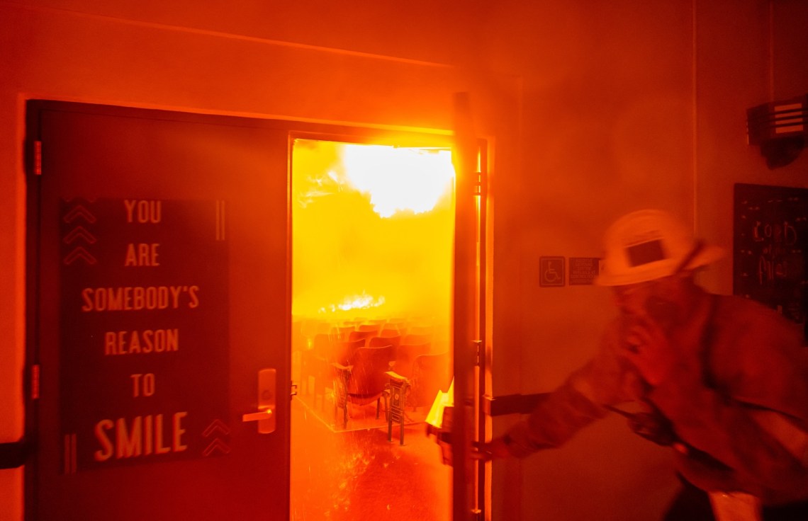 A firefighter opening the door to a burning auditorium inside Eliot Arts Magnet Middle School, Los Angeles, California, January 8, 2025