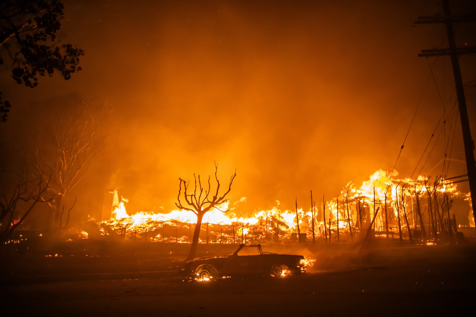 Flames from the Palisades Fire burning a car and homes, Los Angeles, California, January 7, 2025