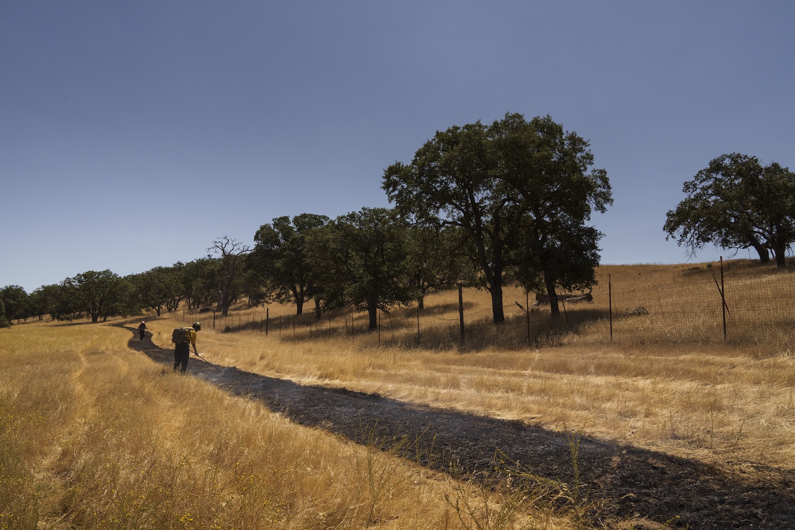 Members of the Central Coast Burn Association managing a prescribed burn operation, Paicines, California, 2023.