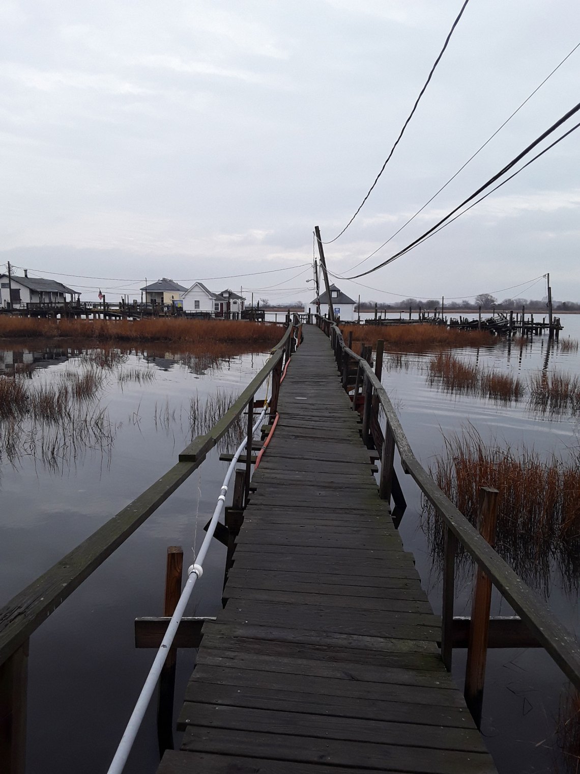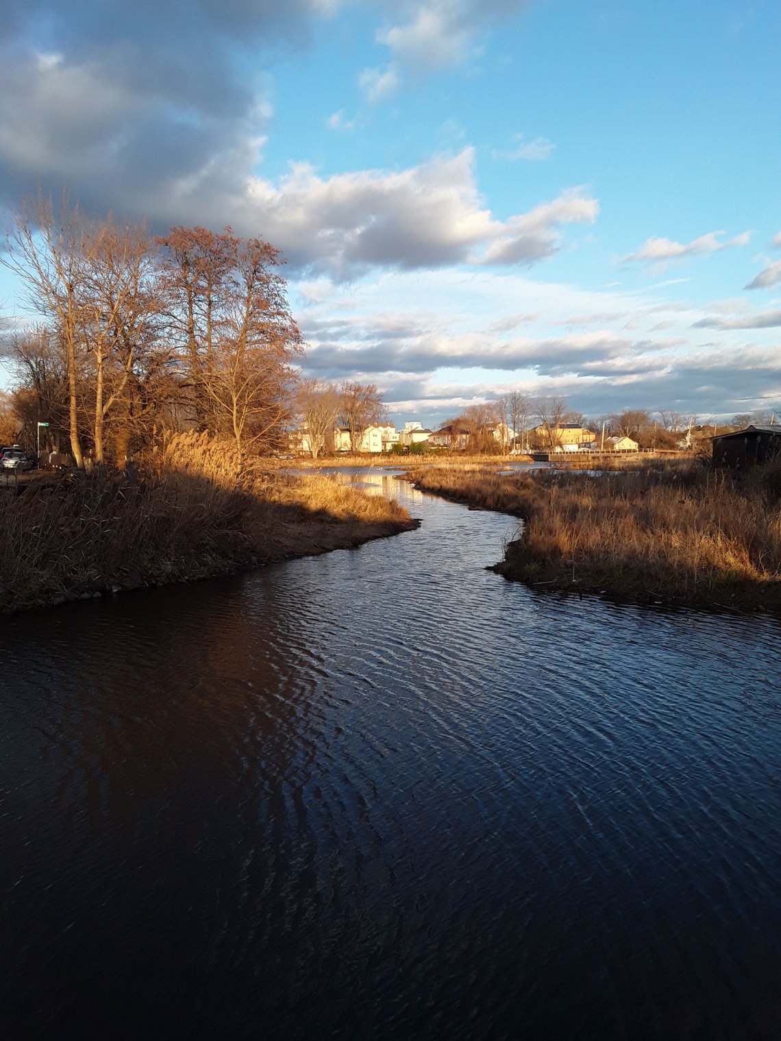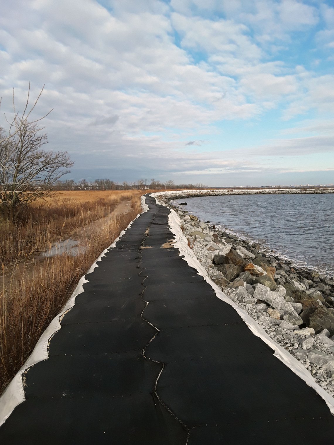 When I visited on a clear-skied day in December, the streets were filled with shallow pools of water. There are a few houses still standing farther away from the shore—the buyout wasn’t mandatory, and several families chose to remain—but large swaths of land hold nothing now but forests of phragmites, the ubiquitous invasive marsh reed, waving their purple tails far above head height. On Kissam Avenue, fire hydrants jut crookedly out of the ground, and driveways lead to nothing but ponds. Each lot is marked off-limits by a small piece of orange plastic fencing and a note from the Governor’s Office of Storm Recovery that forbids trespassing; the ducks don’t seem to have noticed.