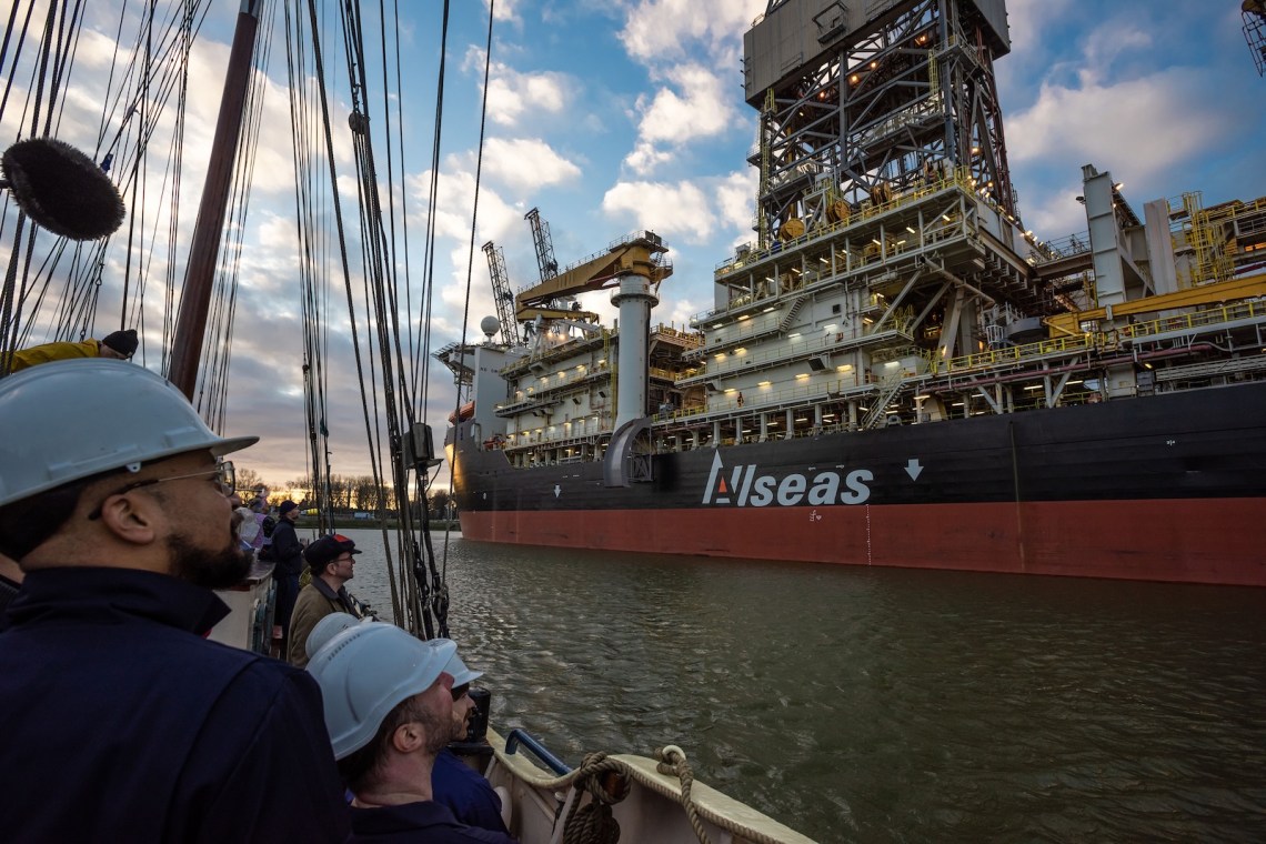 Protesters with the group Ocean Rebellion gathering in front of the Hidden Gem, a ship reconfigured by the Dutch contractor Allseas as a deep-sea mining vessel for The Metals Company, Rotterdam, February 8, 2022