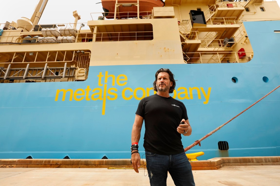 Gerald Barron, the CEO of The Metals Company, in front of a Maersk vessel on which the firm was conducting research on the seafloor, San Diego, California, 2021