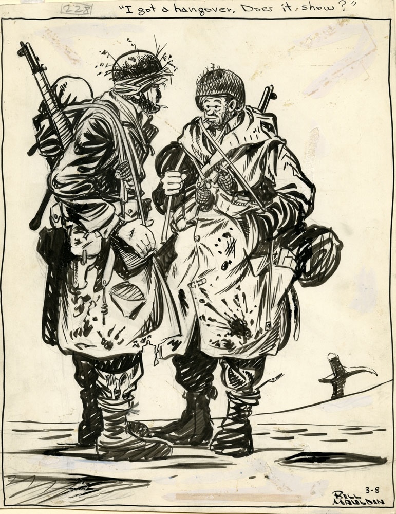 Mauldin, a New Mexico native, enlisted at the age of eighteen and was assigned to the 45th Infantry Division, where he started drawing cartoons about a pair of “dogface” GIs, Willie and Joe, for the regimental paper. The cartoons struck a nerve with the troops, and within a few years he was drawing six panels a week for Stars and Stripes—he was even given his own jeep which he used to tour the front collecting material. (He was wounded in 1943 during the grim fighting at Monte Cassino, southeast of Rome.) Willie and Joe were unshaven, grimy, tired, and resourceful—in other words, the archetype of the American soldier who managed to lick the more spit-and-polish Germans across North Africa, Italy, and off the beach at Normandy. A typical panel might show them digging foxholes: “Me future is settled, Willie,” Joe said. “I’m gonna be a perfessor on types o’ European soil.”