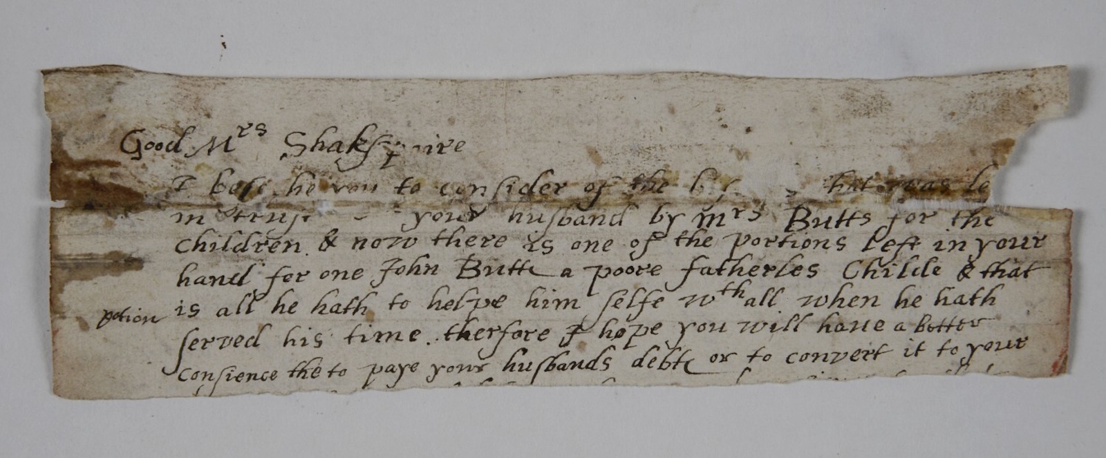 Good Mrs. Shakspaire, I beseech you to consider of the business [that] was left in trust [to] your husband by Mrs. Butts for the children. & now there is one of the portions left in your hand for one John Butts, a poor fatherless child, & that portion is all he hath to help himself withal when he hath served his time. Therefore I hope you will have a better conscience the [sic] to pay your husband’s debt or to convert it to your…