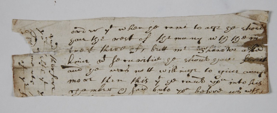 There the fragment ends, but already we have a gist of the story. One of the trustees involved is Mr. Shakspaire. He holds in trust a sum of money—a “portion”—now due to John Butts, who is about to finish his term as an apprentice. The writer hopes that Mrs. Shakspaire will discharge the debt on behalf of her husband, who has been slow and perhaps reluctant to pay up. The second fragment, cut from somewhere in the middle of the letter, adds a faintly threatening mention of law-courts.
