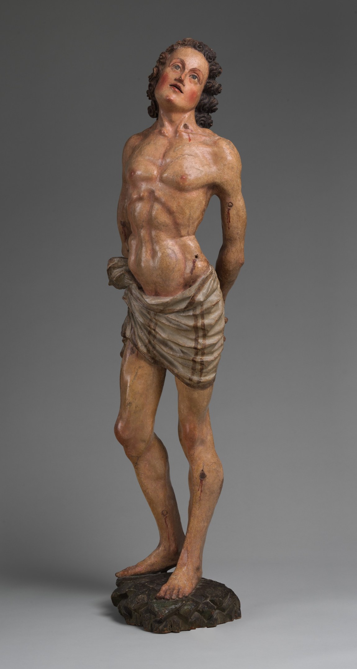 At the Cloisters he is limpidly poised, loincloth jauntily draping over a hip coquettishly cocked. There is little information about this statue, but the erotic posture is undeniable. Again one finds shades of antiquity; the contrapposto pose suggests a familiarity on the part of this anonymous Northern European artist with classical sculpture. You can also see what the iconoclastic Reformers were worried about. Ulrich Zwingli is said to have commented that statues “of Sebastian, a Maurice and the gentle John the Evangelist” were “so cavalier, soldier-like and pimpish that the women have had to make confession about them.”