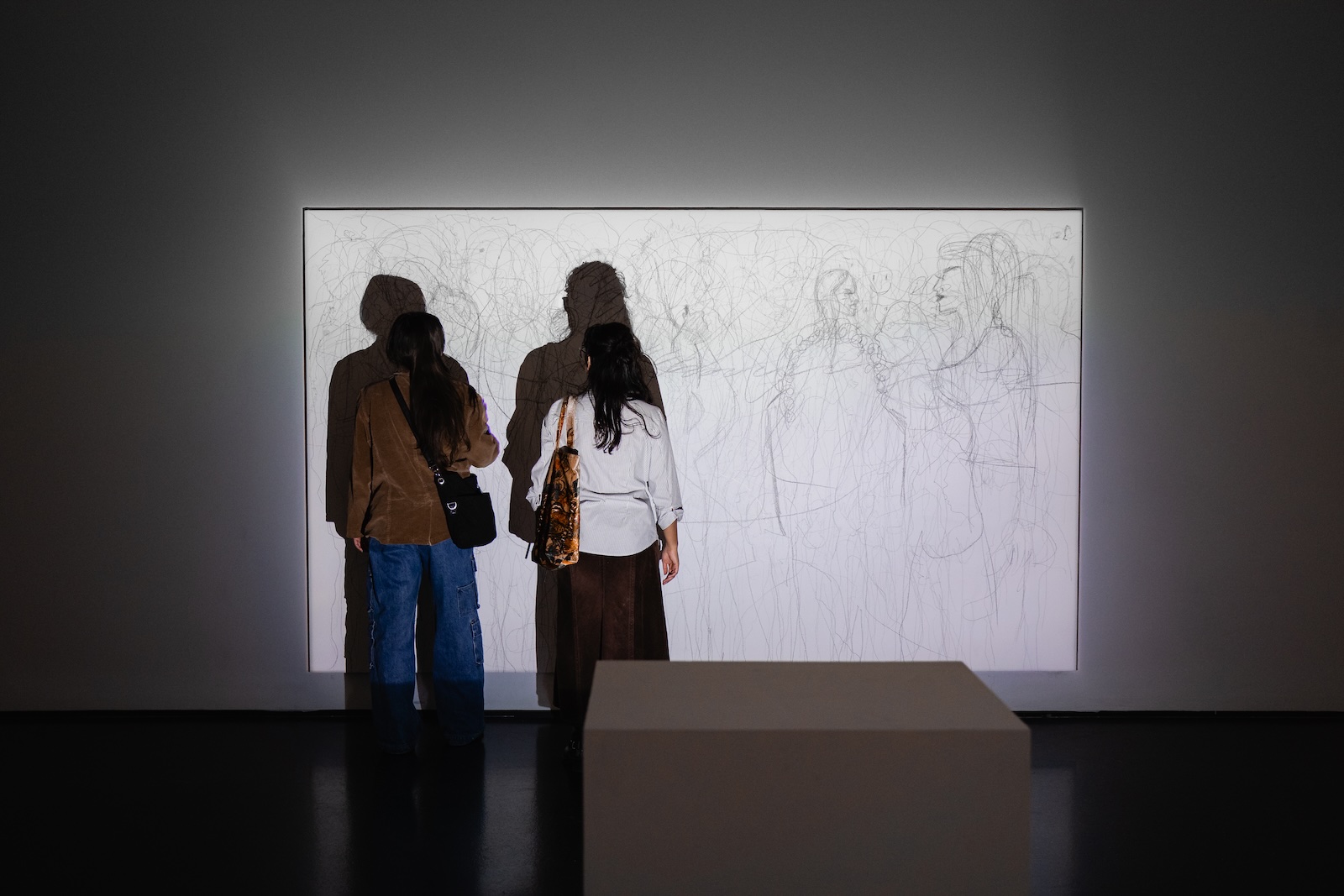 Lennon’s murder is not foregrounded in the exhibition, but grief is alive in every room. It animates works made even before his death, illuminating the project that thrums underneath all Ono’s art: living on in an incomprehensible, bitterly lonely world. Shadow Piece (1963) directs us, “Put your shadows together until they become one.” A large blank canvas is sharply illuminated, such that one person can cast a shadow and another can trace it in soft pencil, accumulating a thousand ghostly silhouettes. It’s one of the few audience-made objects delicate and haunting enough to live beyond its instruction, and one of the few you can’t take part in alone. In SKY TV (1966), one of the first-ever works of video art, a cathode-ray TV, hooked up to a closed-circuit camera on the roof of the museum, streams a live view of the sky.