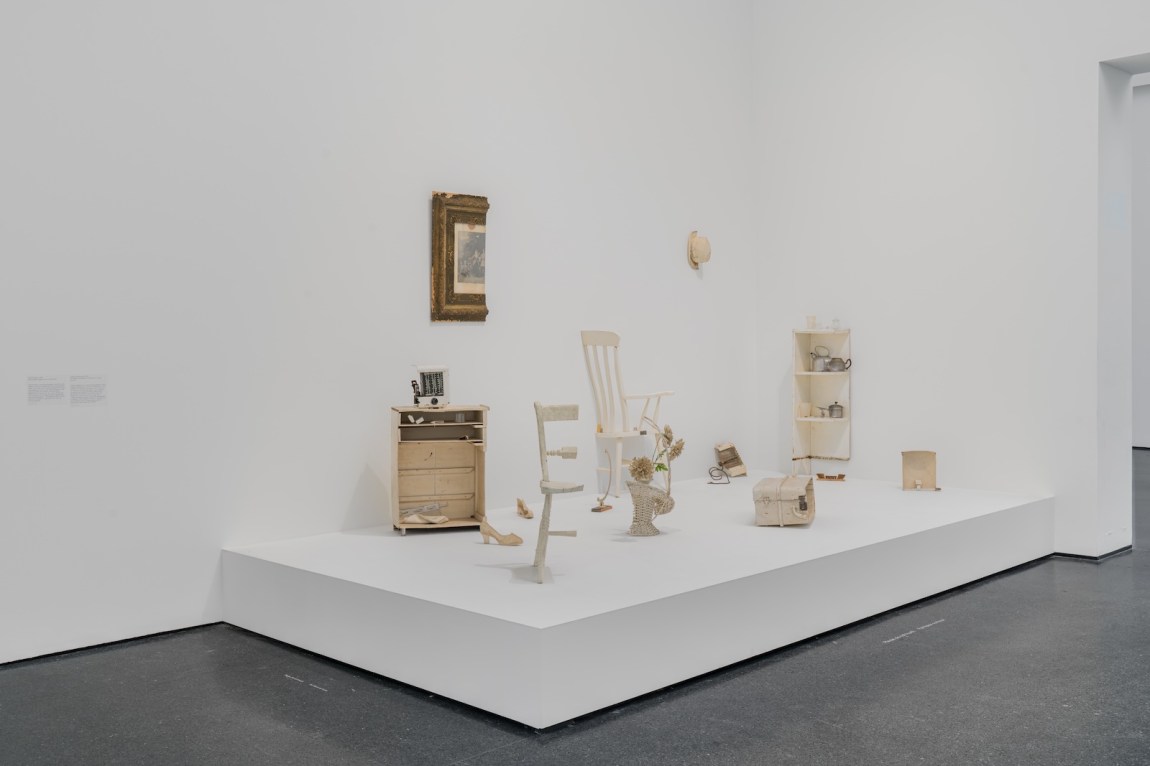 Just as Ono was soon in the Beatles’ studio (at Lennon’s insistence—Sheff hazards that Lennon would have left the Beatles long before if Ono hadn’t been there “literally holding his hand”), Lennon became very present in hers. Half-A-Room is a bedroom of white-painted furniture sawed in half to literalize both heartbreak and a world that at the molecular level is “always at the verge of half disappearing and half emerging.” Lennon’s contribution was a row of empty jars labeled to indicate that they contain the missing halves.