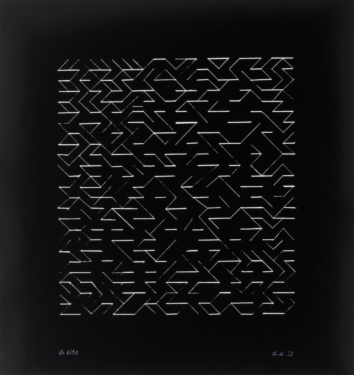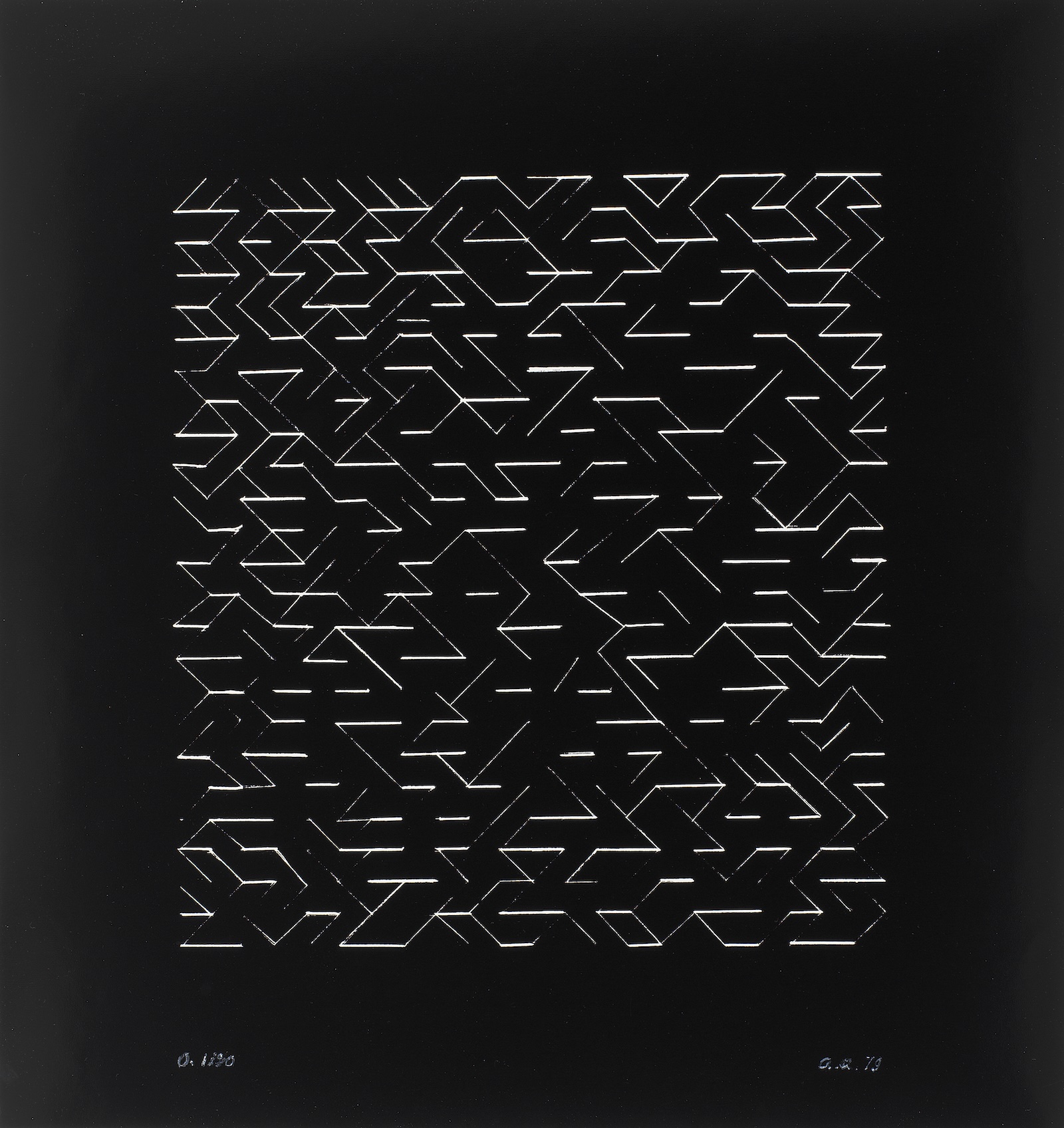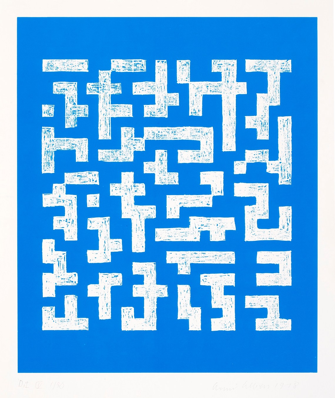 Every Christmas Eve the Alberses listened to Bach’s Goldberg Variations, that astonishing keyboard masterpiece of thirty transformations of a simple aria. Anni approached printmaking as a medium inviting similar variation: reversing, doubling, adding or subtracting color. In a sequence of four variations titled Double Impression from 1978, we can see her gradually leaving behind the weaving modes of thread and grid while embracing more open-ended patterns. The pieces suggest lost languages, crystal structures, computer printouts, and more.