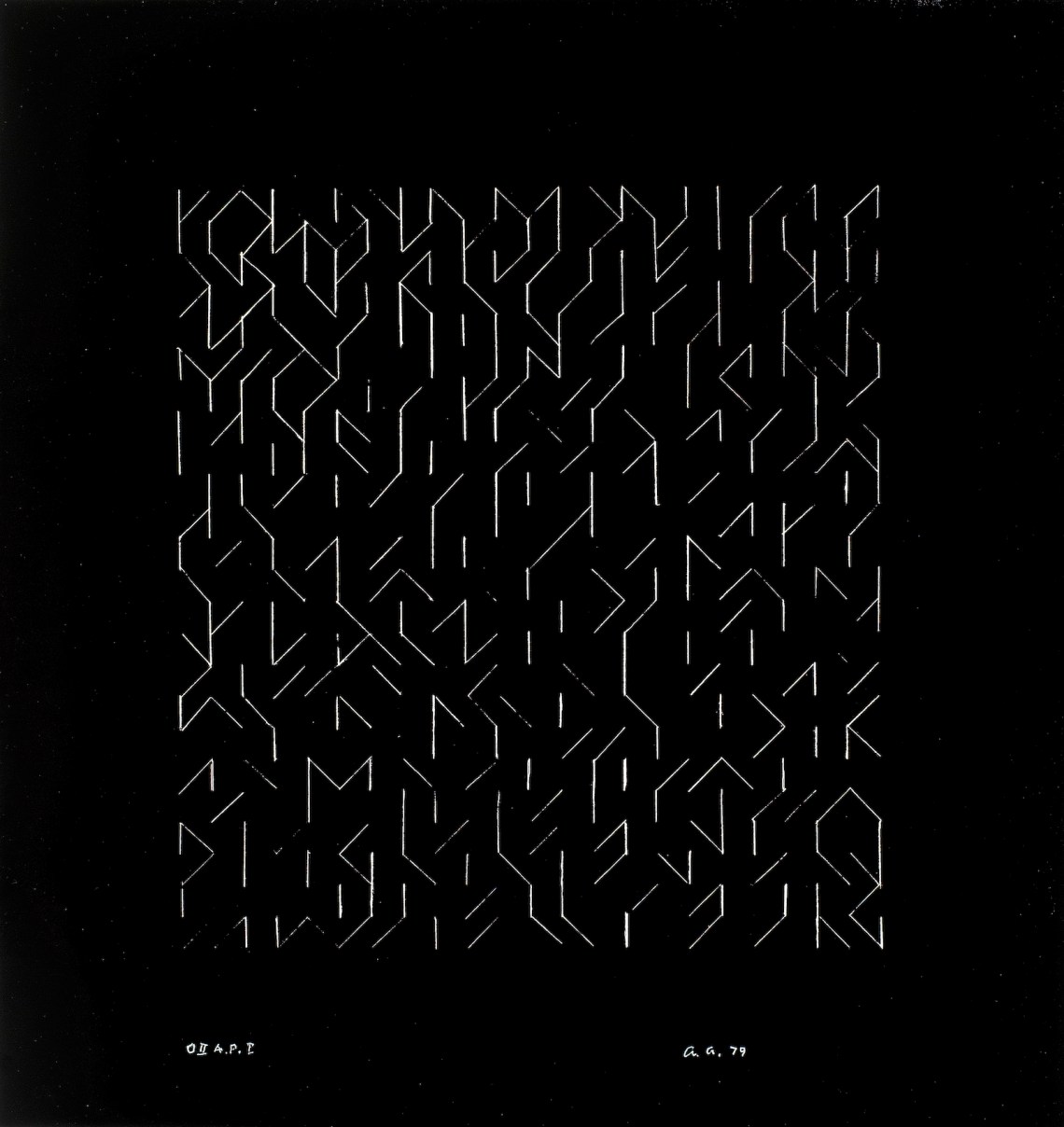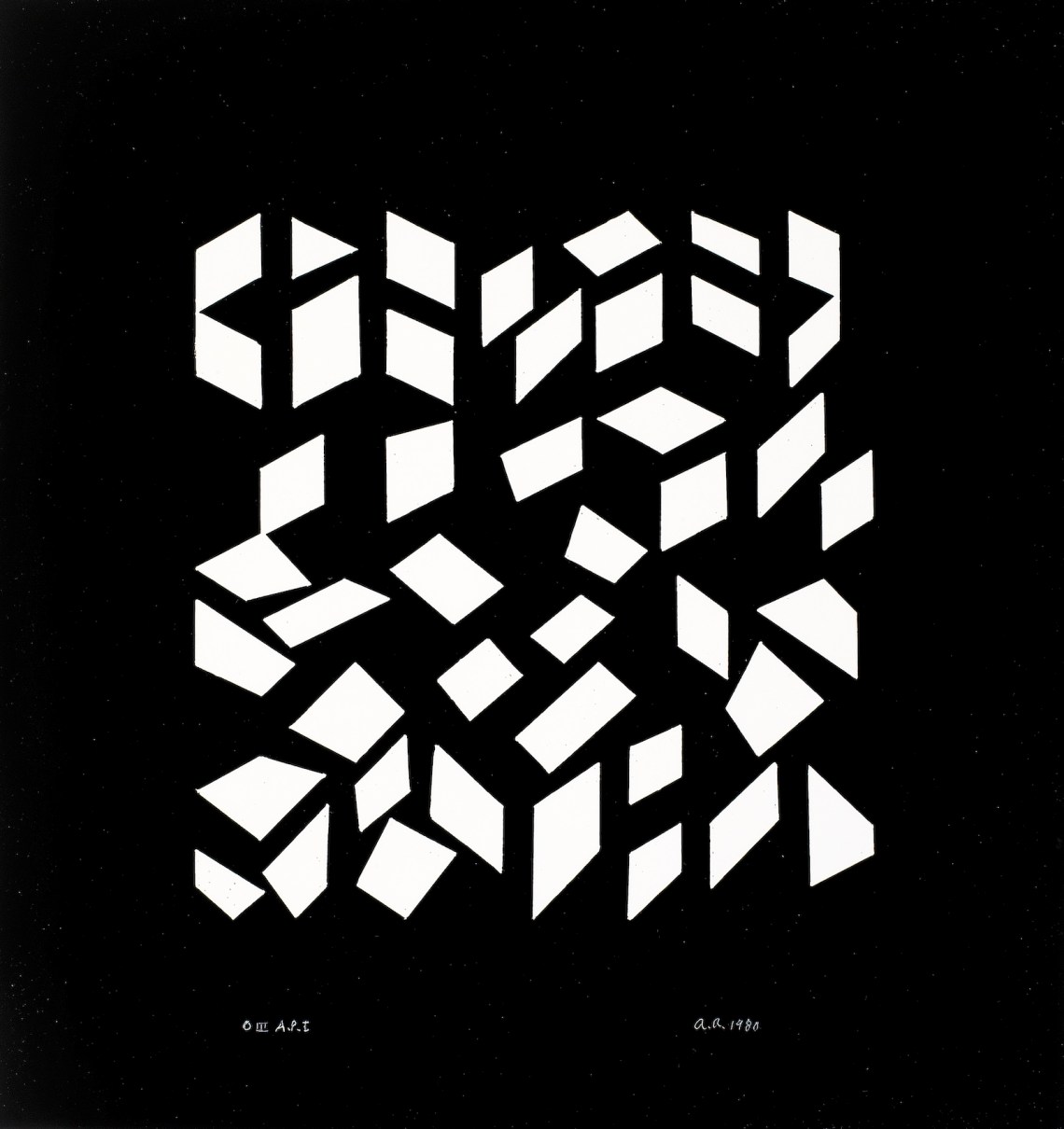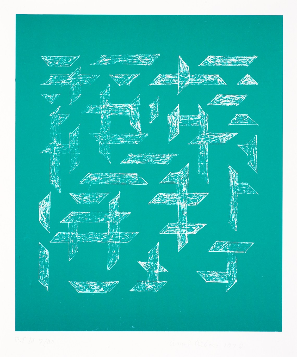 Every Christmas Eve the Alberses listened to Bach’s Goldberg Variations, that astonishing keyboard masterpiece of thirty transformations of a simple aria. Anni approached printmaking as a medium inviting similar variation: reversing, doubling, adding or subtracting color. In a sequence of four variations titled Double Impression from 1978, we can see her gradually leaving behind the weaving modes of thread and grid while embracing more open-ended patterns. The pieces suggest lost languages, crystal structures, computer printouts, and more.