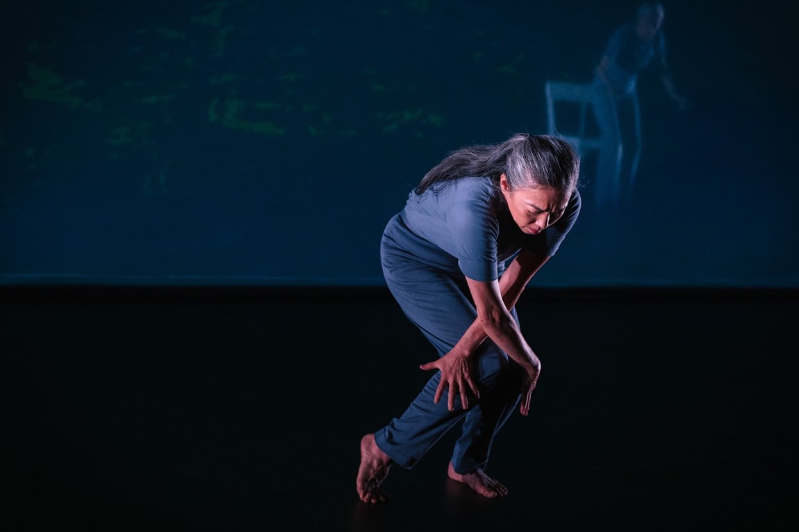 The work’s poignancy arises from the encounter between the two dancers, separated by the blue translucent screen. (Stein: “Twins are one. Does this mean as they separate as they are separate or together.”) At times they move as if in their own worlds, Childs preoccupied by the chair and her immediate surroundings, Orihara entranced by the expanse of the space, testing its limits by pushing against invisible walls. Yet their subtle mirrorings of each other’s gestures, reaching outward as Childs’s voice-over dissolves into a haunting, hollow laughter, convey a powerful yearning for connection. Stein, ironically, shows less of a debt to the structures of Stein’s writing than Childs’s earlier work did. Childs’s delivery, and her extraordinary stage presence, imbue the words with a fresh and specific emotional resonance, transforming the semantic ambiguity they contain on the page into a kind of defiance: “Oh come and believe me oh come and believe me to-day oh come and believe me oh come just for one minute/Age makes no difference.”