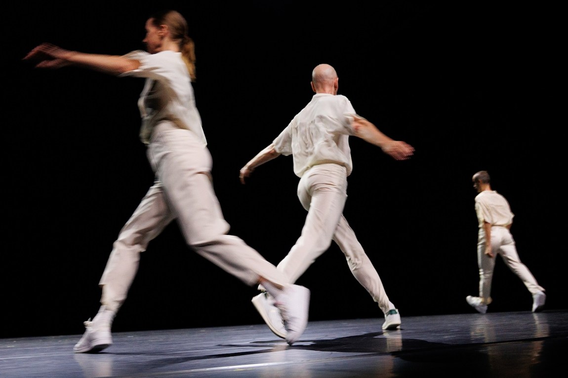 In the early 1970s Childs started developing her signature vision in a series of short dances with no sonic accompaniment, of which the Dance On Ensemble has been performing a suite in recent years under the title Works in Silence; members of the company presented three of them at Radialsystem before the premiere of Stein. Without any props or music, these mesmerizing pieces present the body moving in space. A small group of dancers dressed in utilitarian white suits perform a restricted set of movements in precise formation: walking, running, skipping, leaping, traveling in a circle or along strict, geometric lines. The only sounds are their increasingly heavy breathing and the pounding of their feet on the floor.