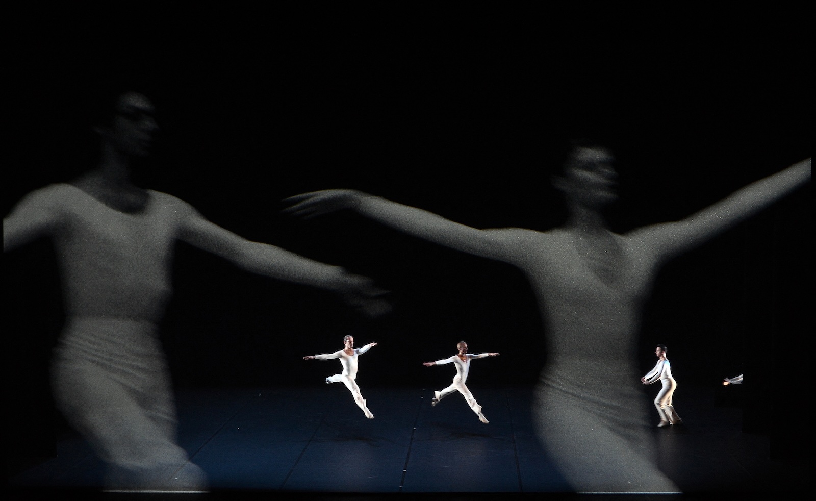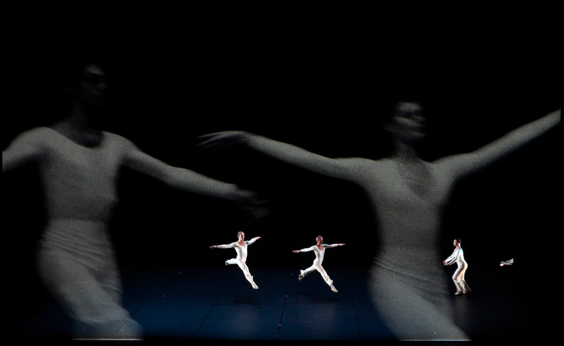 It begins with a white chair slowly gliding across the stage behind a giant gauze curtain. Then two dancers emerge, one from each wing, approaching one another as they edge into view. Projected images of the ocean—a montage of footage and still photographs—flicker on the curtain. A voice-over, glitching slightly, speaks in a calmly undulating rhythm in counterpoint to the languid waves. “For a photograph we need a wall./Star gazing./Photographs are small. They reproduce well./I enlarge better.”