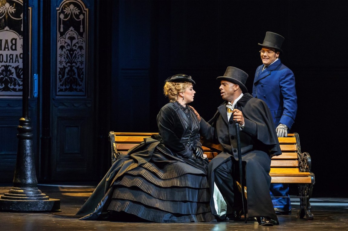 Barlow’s staging, though conservative on the surface, modified the opera’s original scheme in telling ways. First it transposed the action from feudal Spain to late-Victorian London, replacing the aristocracy with the haute bourgeoisie and the Spanish peasantry with cockneys. This choice, which initially puzzled me—why was the opera set in the world of Sherlock Holmes?—took on new significance when coupled with the casting. Leporello is often cast as Giovanni’s double; in Peter Sellars’s famous 1990 film, the two roles were sung by twins. Most productions settle for a vaguer resemblance, making the singers the same height or same build. In Santa Fe, Green and his Leporello, Nicholas Newton, were two of three Black singers.