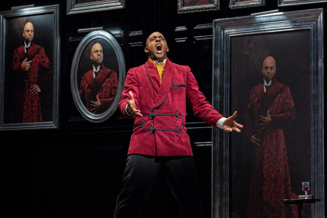 The third was Soloman Howard, superb and iron-voiced as the Commendatore.3 Howard played one of the few men in the opera not confused with the seducer. Yet in Barlow’s staging they were closely linked, and not just because, with Newton, they were the only Black men onstage. In the finale, rather than appearing at the door in the form of a statue, Howard emerged from one of those ridiculous paintings, clad in a singed red dressing gown. He was another double—a haggard portrait of Giovanni’s soul. Green rushed at him with a carving fork, seeming to stab him before falling to the ground, the fork protruding from his own belly. The final sextet was sung over his corpse. Having neglected to read the press materials, that was when I finally grasped the opera’s setting: it was the London not of Conan Doyle but of The Picture of Dorian Gray.