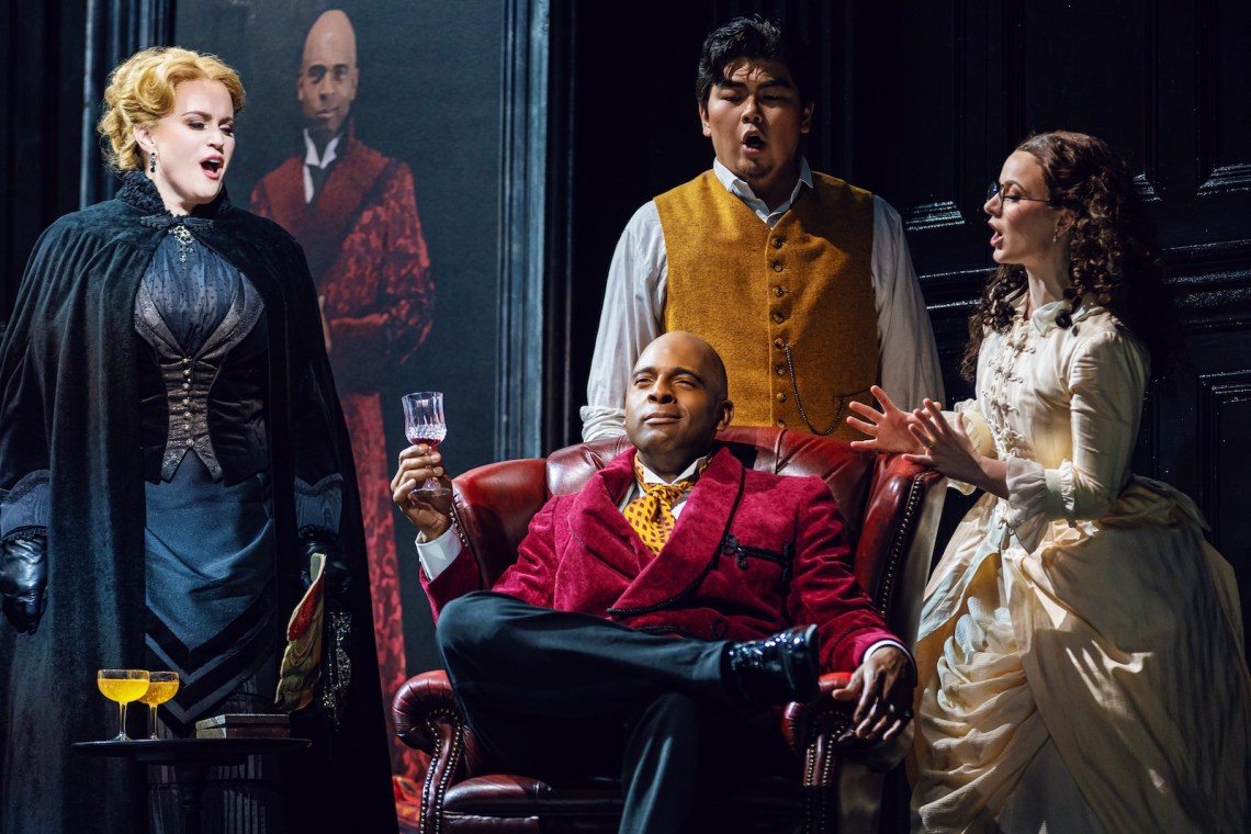 From left: Rachel Willis-Sørensen as Donna Anna; Ryan Speedo Green (seated) as Don Giovanni, William Guanbo Su as Masetto, and Liv Redpath as Zerlina in the Santa Fe Opera’s production of Don Giovanni, 2024
