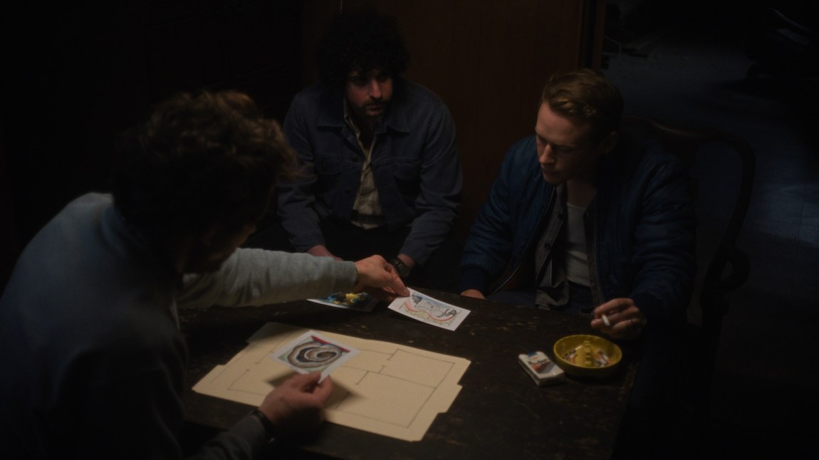 Though his plan quickly unravels—as plans almost always do in heist films, even heist films featuring thieves much sharper than Mooney—his initial role in the theft, as the movie’s title suggests, is simply to be its “mastermind.” He haunts the museum day after day, surveying its layout and drawing a floor plan and illustrations of the Dove paintings for his lackeys to reference. He provides money, a meetup spot (the basement of his family’s suburban home), even pantyhose to wear as disguises, but he intends to do as little of the dirty work as possible. When Larry Duffy (Cole Doman), the getaway-driver-to-be, who has a healthy amount of skepticism toward Mooney, asks why he’s not taking part in the actual heist himself and how he plans to sell the stolen paintings, Mooney shrugs off his doubts. As one might expect, Larry bows out of the plan, and the boss is left to drive the getaway car himself.