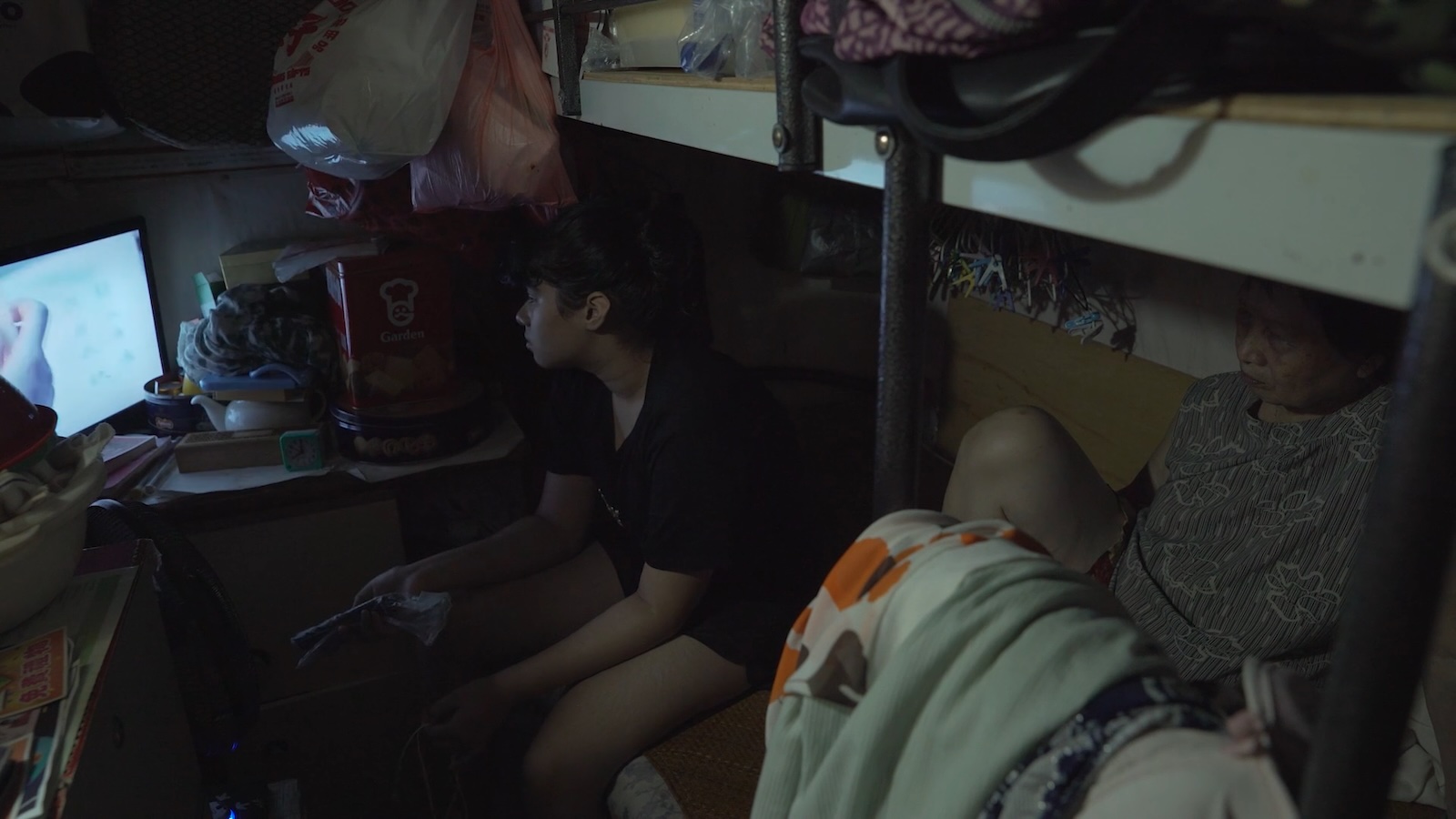 Her thesis project, 32+4 (2015), already shows a striking awareness of how Hong Kong’s cramped infrastructure both shapes its residents’ domestic lives and reflects the fraught trajectories that brought so many of them to the city in the first place. The opening shot is of an ordinary street seen through a window, before the film cuts to show Chan, perched on her bed, blocking out the light with black construction paper. In diaristic narration—conveyed only through onscreen text—Chan discusses how she came to live in this space, one of the many subdivided flats (lofts partitioned into multiple tiny units) that provide the remnants of affordable housing in the city. Her mother, she explains, left her father and married her stepfather soon after arriving in Hong Kong—but they all still live in the same housing estate, where they share an elevator bank. A blurry still shows a moment when Chan recorded her father and stepfather passing each other, possibly unbeknownst to either of them; throughout the film Chan tries to interview her mother only for the older woman to defensively evade her questions about the past.