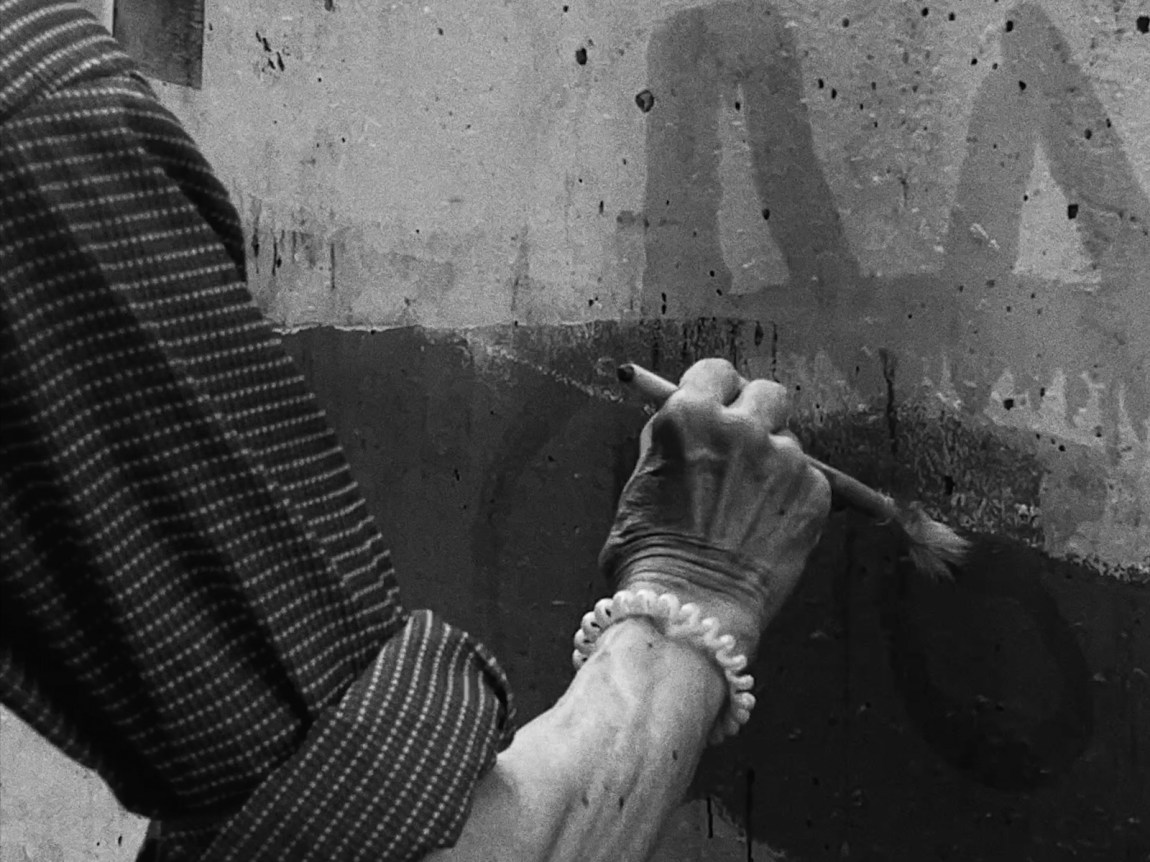 Also interspersed throughout are fragments of footage that Chan shot of the 2019 protests. A scene of a musical action—protesters playing trombones and clarinets in a park—plays without volume, except for the isolated, plaintive sound of a woman blowing on a blade of grass; fuzzy images depict what might be figures tending to a hedge, until we realize that they are stripping protest flyers from its branches. The result is not so much elegiac as defiantly evasive. One man, the protagonist from Searching Lau, describes getting arrested after surveillance cameras captured him writing a character associated with the protests on a city wall. Now he uses water, which the cameras can’t pick up, to tag buildings around Hong Kong with his seemingly innocuous drawings: a smiling sunflower, spindly-rayed suns, goofy cat-like creatures.