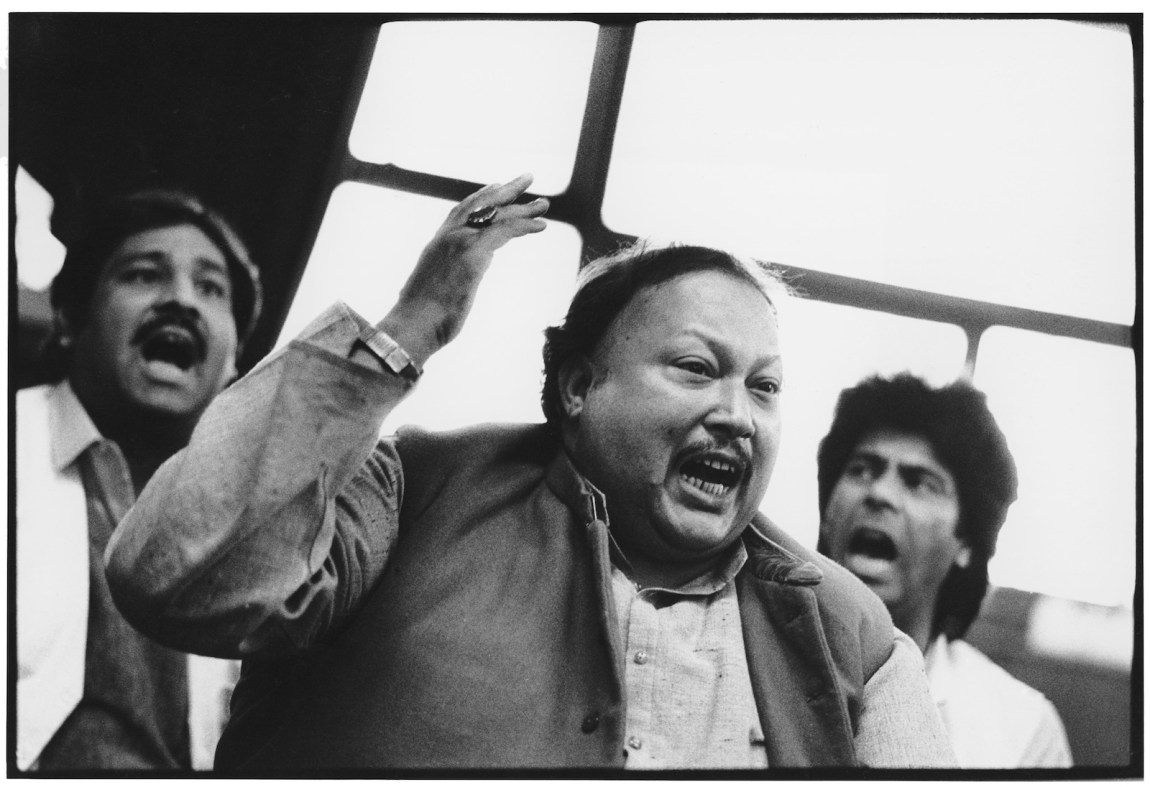 By the late 1970s Nusrat’s music had reached the diaspora in Birmingham, England. Oriental Star Agencies—a young record label committed to promoting South Asian music—released his first albums overseas, catapulting him to stardom among Pakistanis, Indians, and their émigré communities. In 1981 he made his first foray into Bollywood, contributing an incantation, “Haq Ali” (“Truth Is Ali”), to the film Nakhuda, about the relationship between a Muslim inn owner and his Hindu tenant and mentee. This undulating, meditative praise song to Ali (a venerated figure in Islam) was a world away from the up-tempo Bollywood numbers that would characterize his later career.