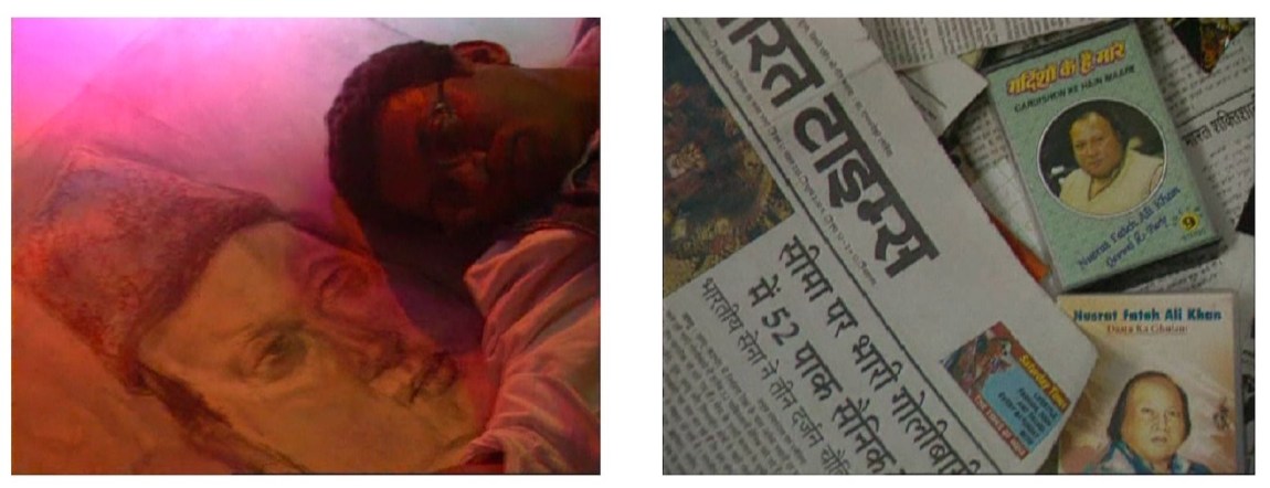 Two winters ago, more than two years after my father died, I was sifting through the detritus of his life. Among his old canvases and decades-outdated calendars, I came across a DVD labeled Aarzoo-e-Mohabbat (A Desire for Love), after a Nusrat song. This was the title my father had given a somewhat tacky—though narratively wild—short film he had made as an unknown, struggling artist in 1999. It turned out to be a potpourri of indulgent recitations of left-leaning Hindi poetry and various impressions of Mumbai’s street life, sustained for nearly all of its seventeen minutes by Nusrat’s voice. At one point the actor Irrfan Khan (who would later achieve international acclaim in The Namesake) makes an appearance as a troubled painter who draws a large portrait of Nusrat and then lies beside it.