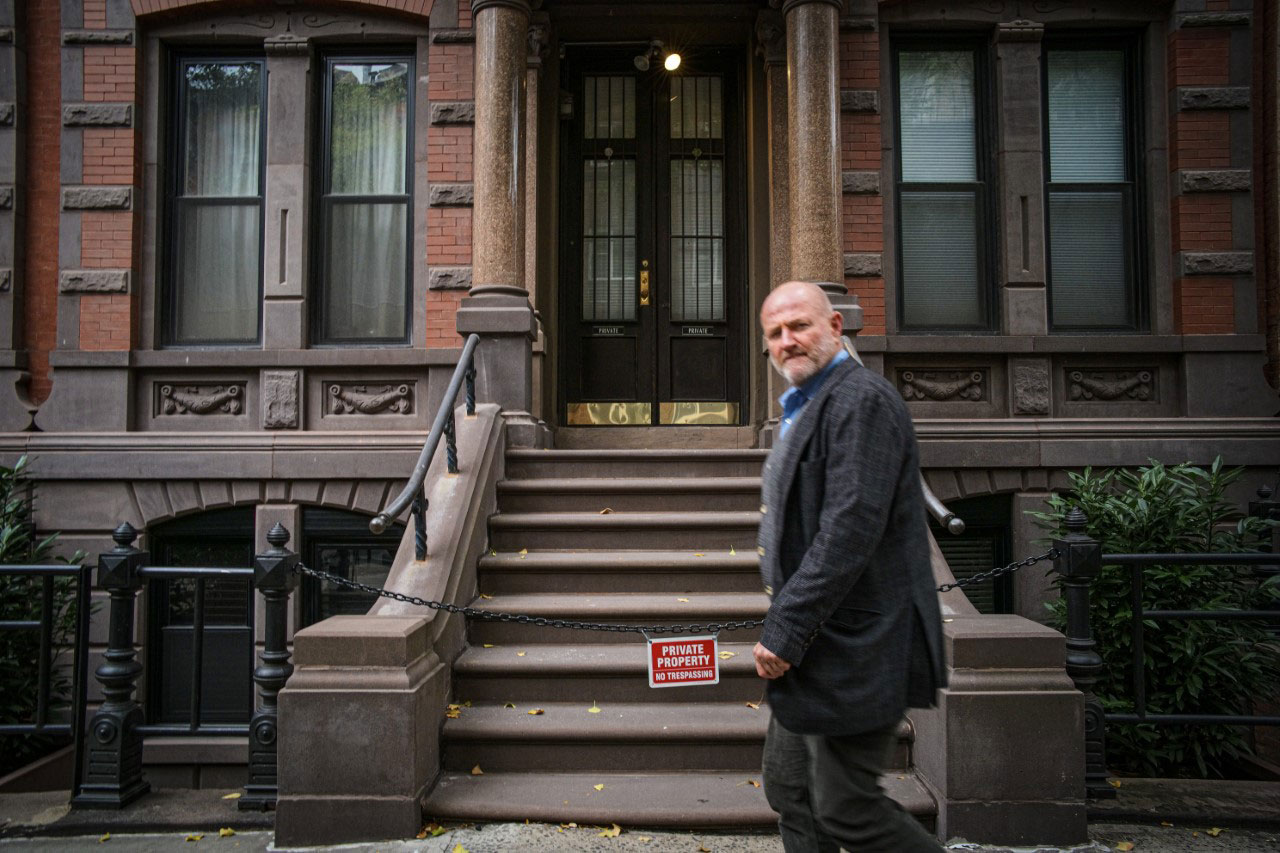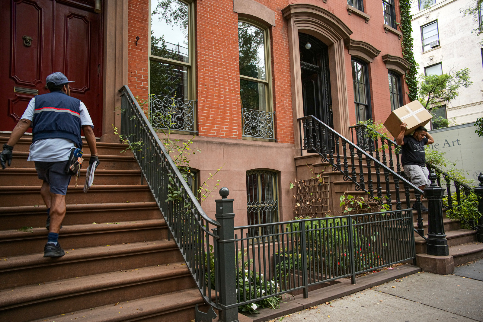 On today’s Bank Street, I saw hired staff sweep the brownstones’ stoops, their lacquered front doors free of dust. For Halloween, their owners have decorations installed professionally. In the springtime, machine lifts deliver exotic plants to rooftops. Professional bouncers stand guard at doorways during annual house parties, for which all furniture is removed in advance. All the time, tersely polite notes like “guests and deliveries welcome” hang on delicate chainlink fences at the foot of steps, to block passersby from sitting or posing for photographs. Those notes are ignored by the constant stream of tourists who flock to the West Village. When I walk by the corner of Bank Street and Greenwich Avenue, I see a man collecting bottles, a FedEx deliveryman drenched in sweat as he unloads and stacks cardboard boxes, their labels suggesting meal-kits, electronics, and furnishings inside. A bicycling deliveryman working for Caviar is taking a water break on the stoop one of the shuttered restaurants. Harvey Weinstein lived across the street, at 13 Bank Street, before he sold his mansion in 2018 for $25.6 million. One afternoon during my first week of living in the neighborhood, I was startled by someone growling, “Fuck you and FUCK your foundation.” There was Weinstein on his phone, his driver sitting in a nearby idling black Suburban.