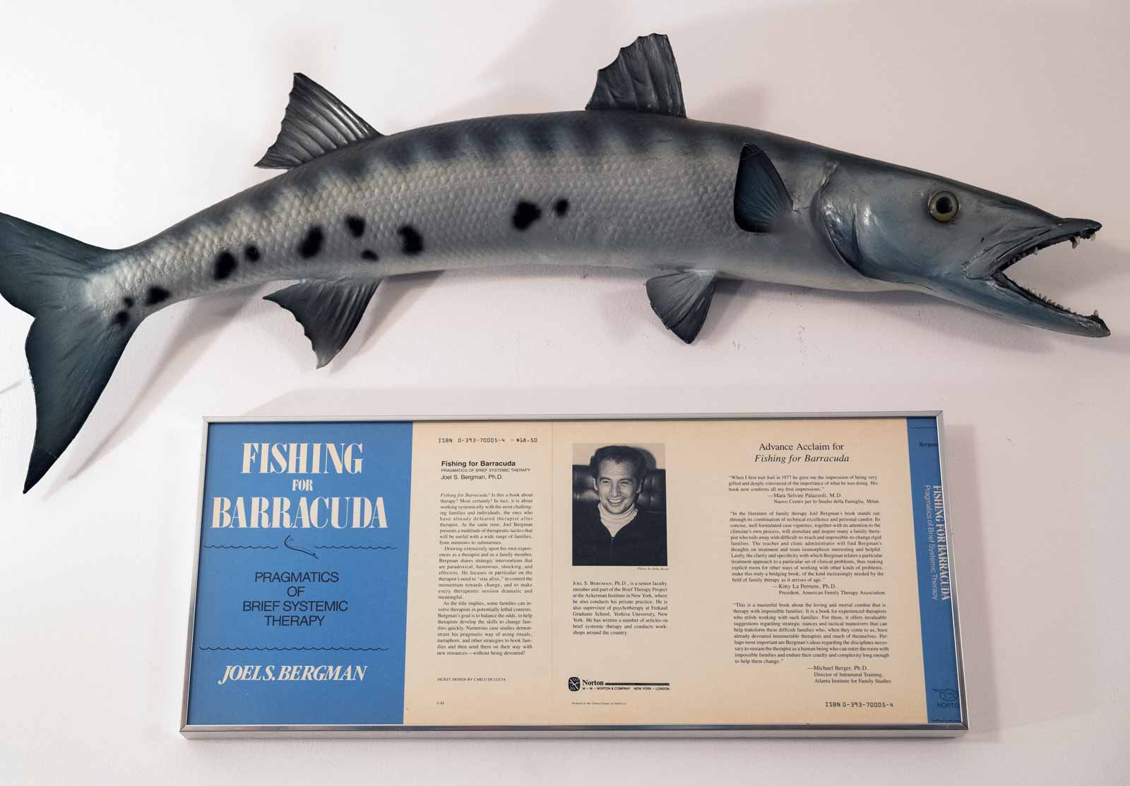 Like Kelley, Bergman occupies two offices side-by-side. They are joined by a door and a two-way mirror for training therapists in working with couples and families. He has filmed many sessions, and years’ worth of chunky videotapes fill the first room, watched over by a mounted barracuda, in honor of his book Fishing for Barracuda, which he says is about “working with families that scare the shit out of most therapists.” In his main office, he’s got a large, cluttered desk with a sign that reads, “Show Me The Money.” On the wall hangs a poster of Einstein with the quote: “Great spirits have always encountered violent opposition from mediocre minds.” Underneath sits a keyboard piano. Bergman is a jazz pianist, and he uses the keyboard during sessions.